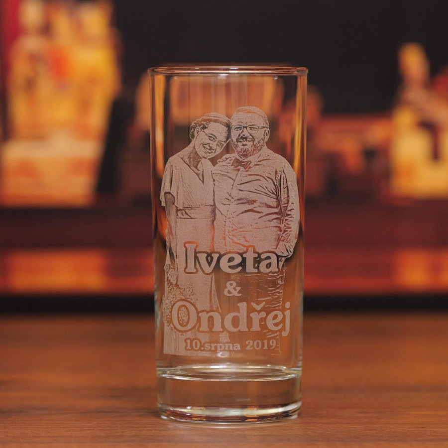 Ukázková sklenicer: Na naší produktové fotce vidíte sklenici na víno s vygravírovanou svatební fotografií a jmény novomanželů. Toto je jen malý příklad toho, co pro vás můžeme vytvořit.